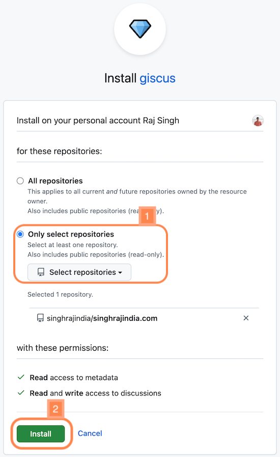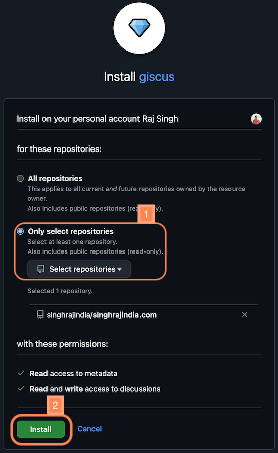 Next, you’ll need to install the Giscus app on your GitHub repository. This app facilitates the creation of discussions and allows users to leave comments. When a reader leaves a comment for the first time, the app will automatically create a new discussion.