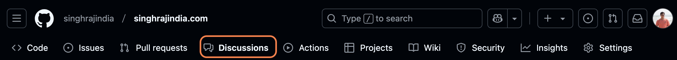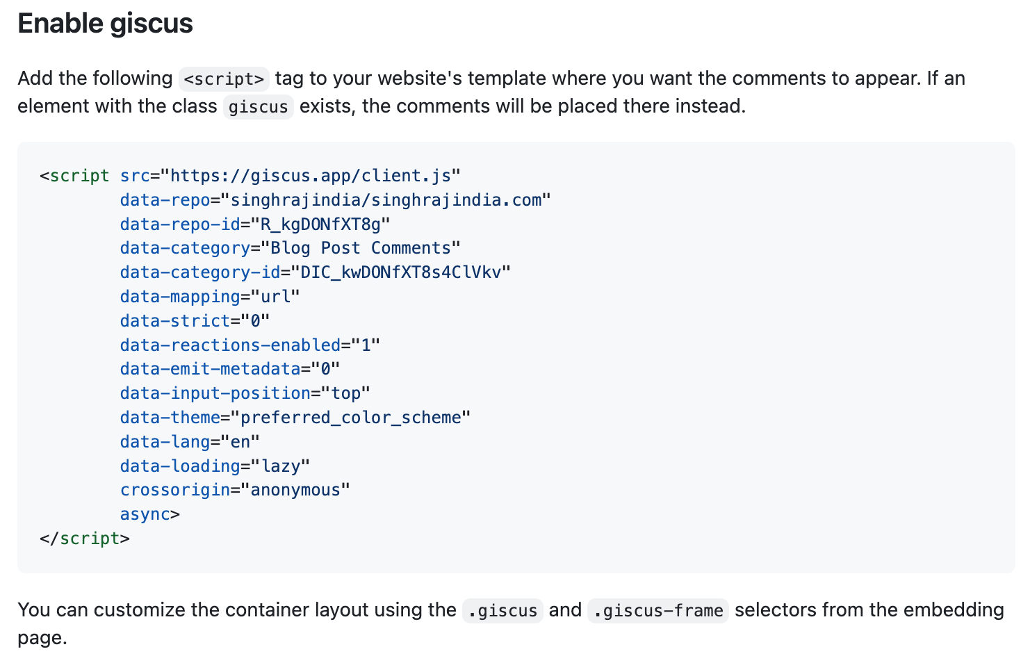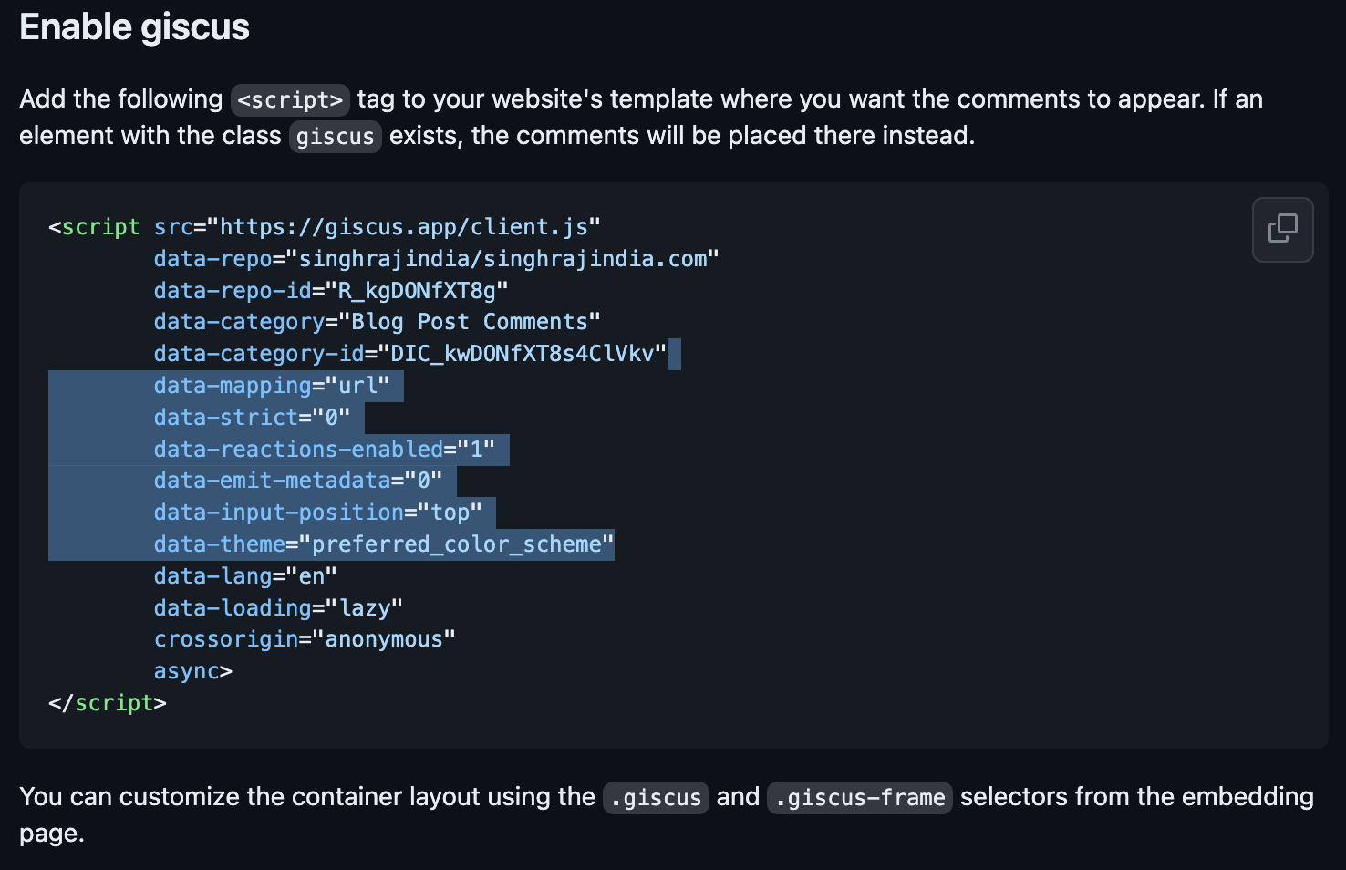 <script src="https://giscus.app/client.js" data-repo="singhrajindia/singhrajindia.com" data-repo-id="R_kgDONfXT8g" data-category="Blog Post Comments" data-category-id="DIC_kwDONfXT8s4ClVkv" data-mapping="url" data-strict="0" data-reactions-enabled="1" data-emit-metadata="0" data-input-position="top" data-theme="light" data-lang="en" data-loading="lazy" crossorigin="anonymous" async></script>- Copy the following code to the top of the page where you want the comments section to appear
