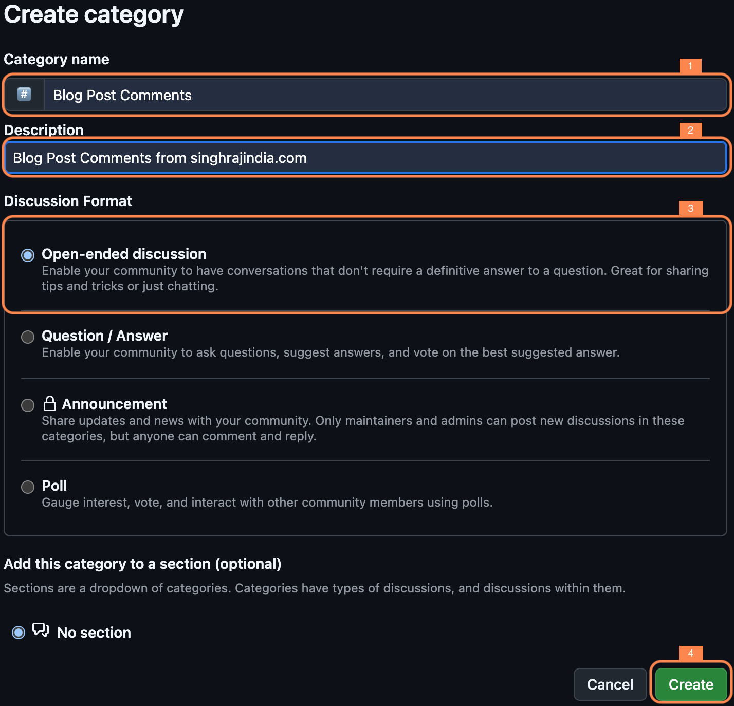Finally, create a specific category for blog comments within GitHub Discussions. To do this,