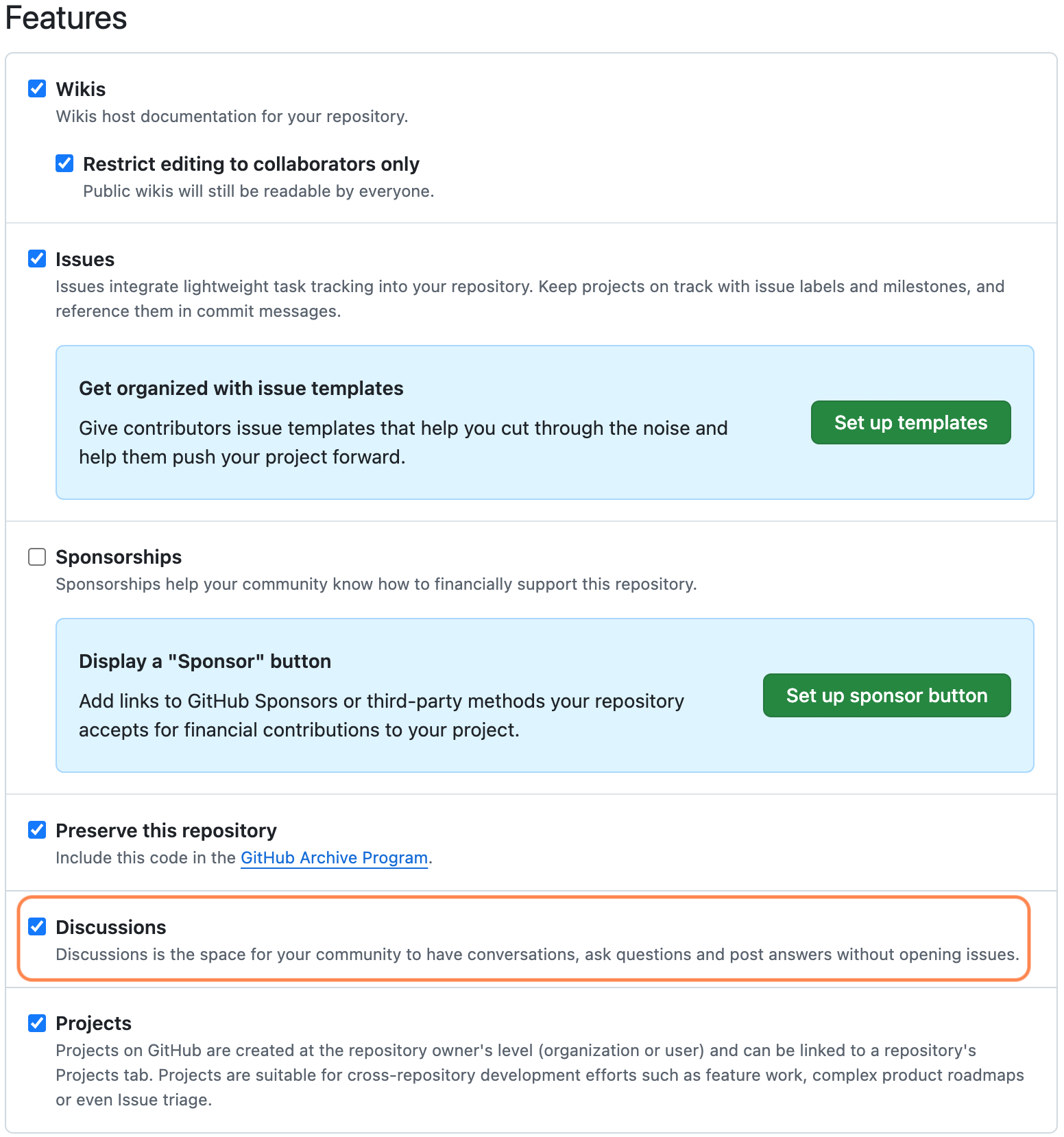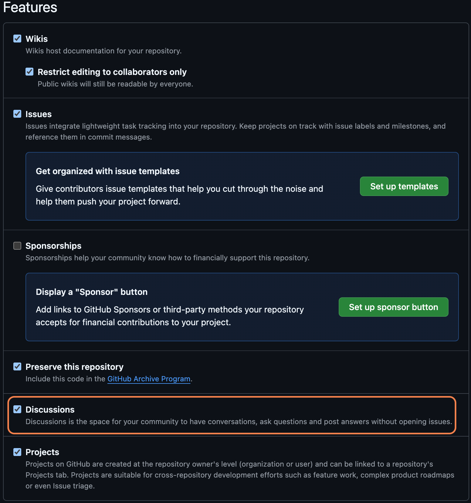 - From the left navigation make sure General is selected. Scroll down to the Features section and select checkbox for Discussions.