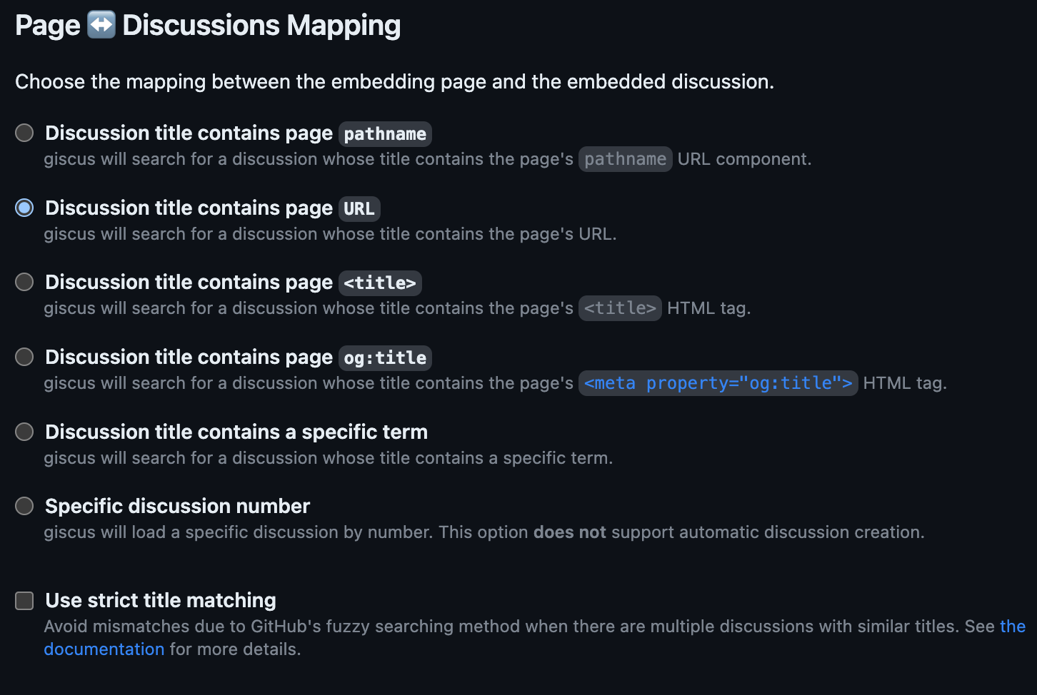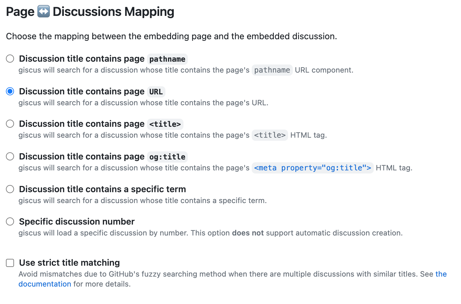 - On the same Giscuss App home page scroll further down to Page ↔️ Discussions Mapping section and select second option Discussion title contains page URL