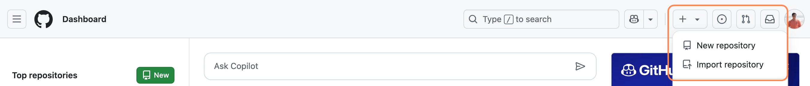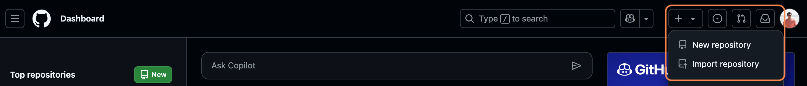- Once you are logged in click the + (Plus) sign in the menu bar on top-right and select New repository from the dropdown.