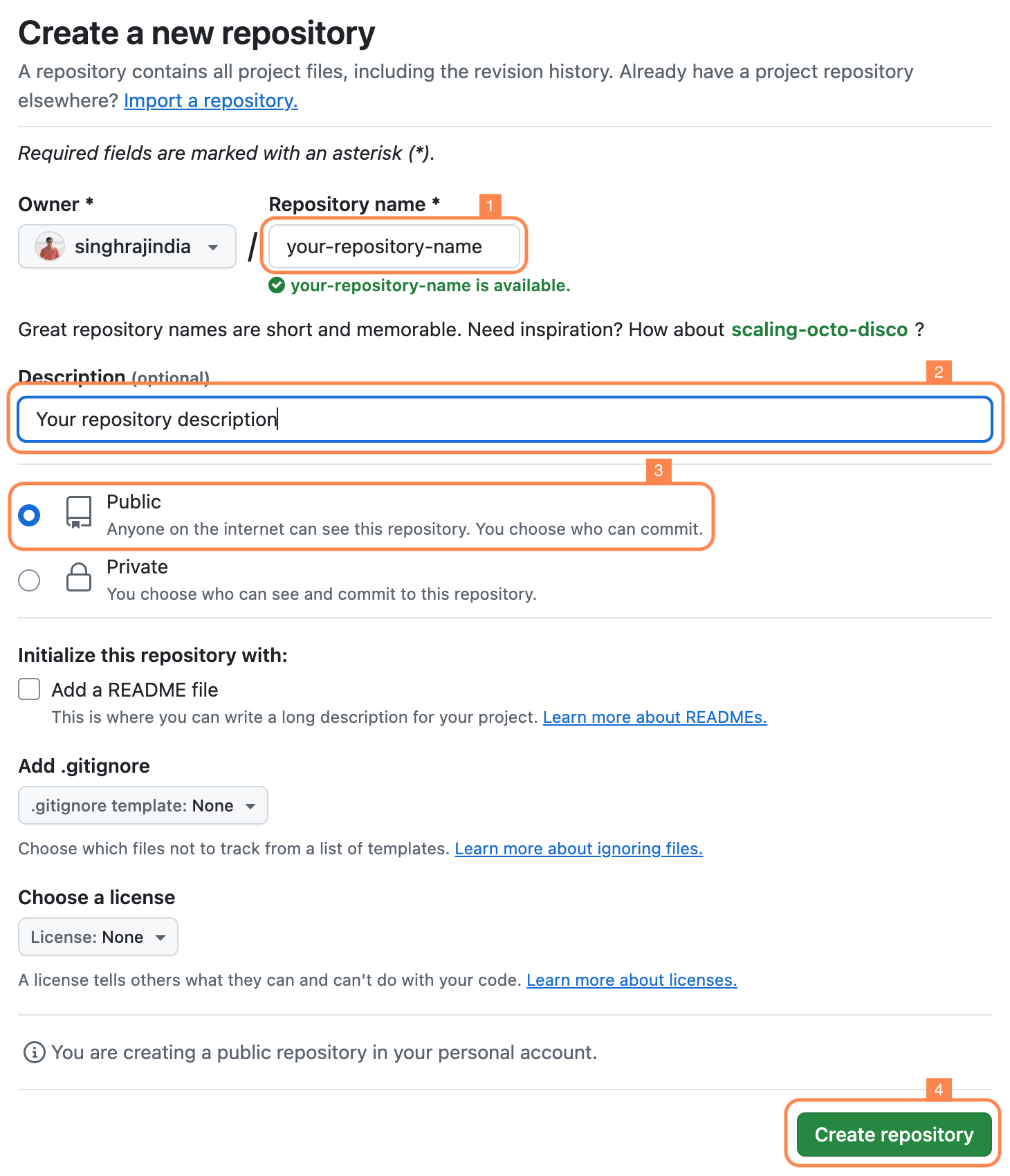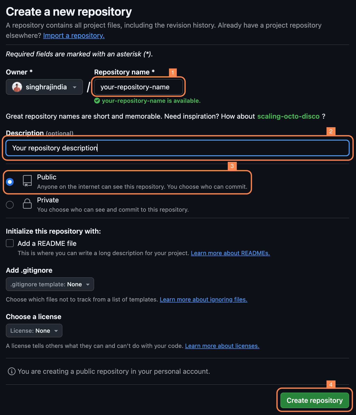 - On the next page specify the Name and Description of the repository. Keep the repository as Public. Click Create Repository buttom at bottom-right of the page. Please note that, for Giscus to work properly, it is necessary that the repository is public.