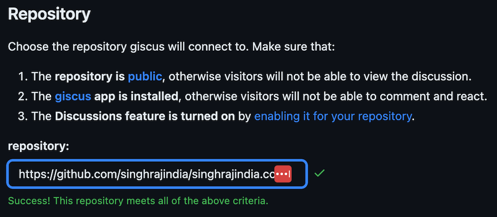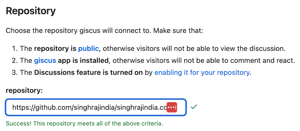 - Under Repository segment it lists out the steps that we have followed above. Enter your GitHub repository URL (on which you enabled Giscus) in the textbox provided below the steps.